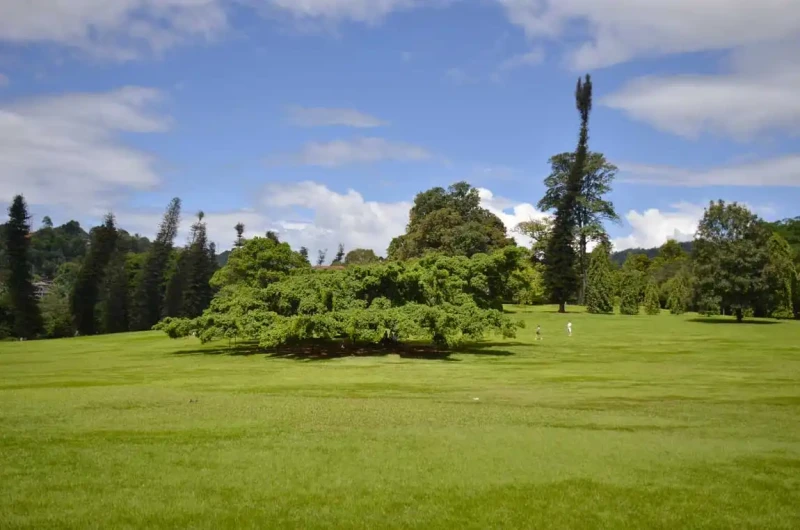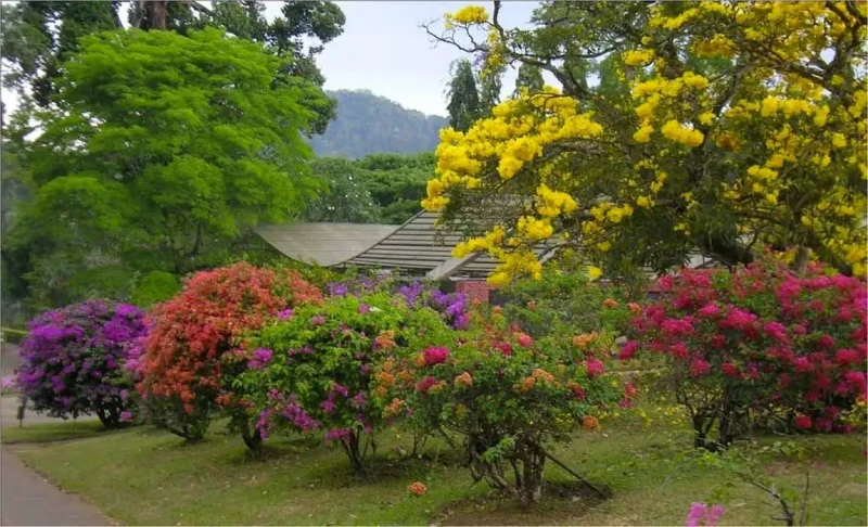 Royal Botanic Gardens, Peradeniya are about 5.5 km to the west of the city of Kandy in the Central Province of Sri Lanka. In 2016, the garden was visited by 1.2 million locals and 400,000 foreign visitors.It is near the Mahaweli River (The longest river in Sri Lanka). It is renowned for its collection of orchids. The garden includes more than 4000 species of plants, including orchids, spices, medicinal plants and palm trees. Attached to it is the "National Herbarium of Sri Lanka".